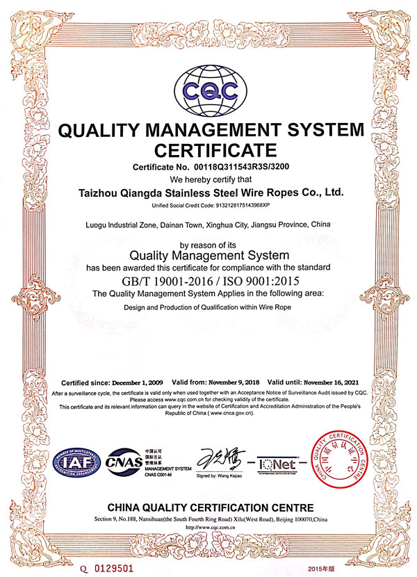 泰州市強(qiáng)達(dá)不銹鋼絲繩有限公司位于江蘇興化市戴南經(jīng)濟(jì)開發(fā)區(qū),公司致力于不銹鋼絲繩產(chǎn)品生產(chǎn),立志成為“國內(nèi)技術(shù)標(biāo)桿型吊索具生產(chǎn)企業(yè)”。以此戰(zhàn)略思想指導(dǎo),公司堅決貫徹“質(zhì)量贏市場,管理增效益,誠信贏天下”的質(zhì)量方針。以完善的服務(wù)在國內(nèi)不銹鋼絲繩市場樹立良好的品牌形象。公司榮獲“江蘇省質(zhì)量信得過企業(yè)。 靈活的管理機(jī)制,經(jīng)驗豐富的